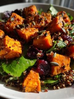 For something really impressive for brunch, slice an avocado in half, remove the pit, and generously spoon the salad right into the center where the pit used to be. It’s beautiful! And if you’re trying to keep things warm while still eating healthy, this stuff is magnificent dolloped on top of a baked sweet potato. The sweetness of the potato just amplifies the cranberries—you’ve got to try it!